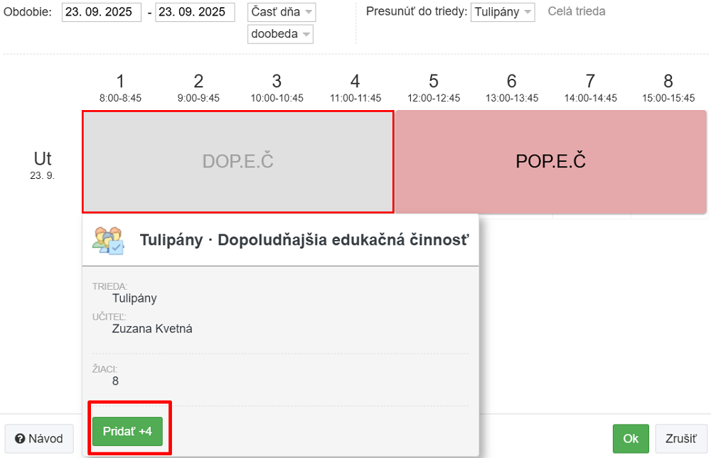 V našom prípade chceme preradiť 4 deti z triedy Slnečnice do triedy Tulipány na deň 23.9.2025 na hodinu Dopoludňajšia edukačná činnosť.
