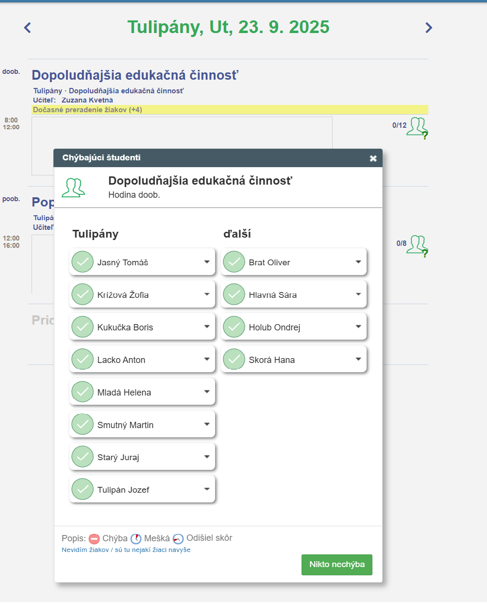 V triednej knihe Tulipánov vidíme aj dočasne preradené deti z triedy Slnečnice