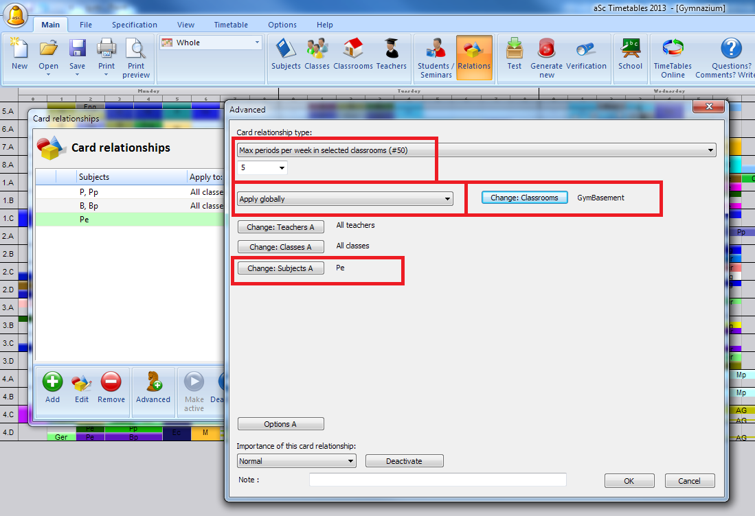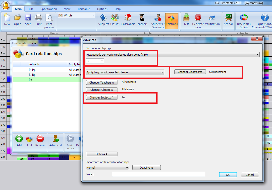 For example you have two Gyms at your school. Big and small. Unfortunatelly these are not enough to accomodate all your Physical Education lessons, so in some cases you allow the Gym to be in the cellar in the basement.