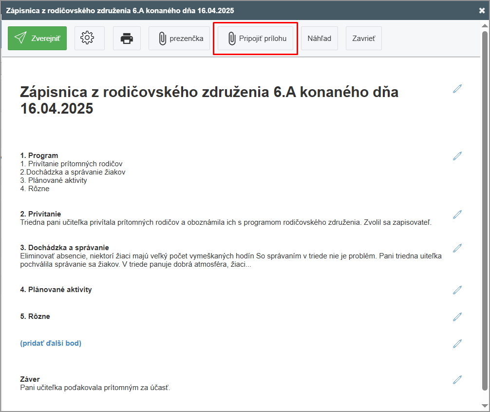 K zápisnici môžete pripojiť tabuľku ako prílohu: