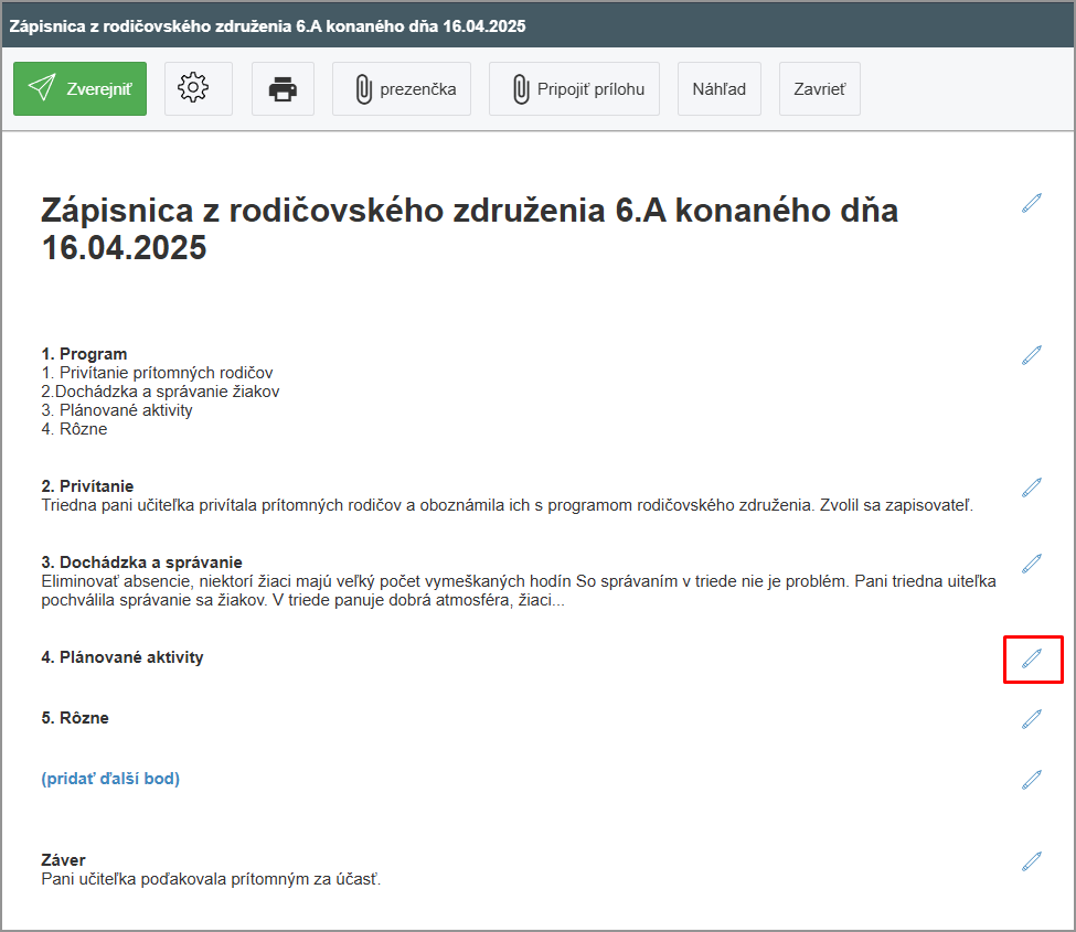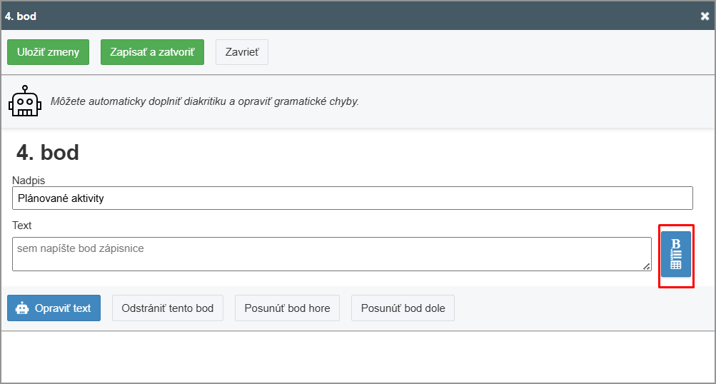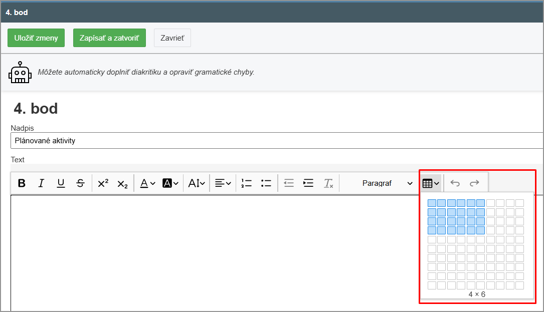 Alebo je možné tabuľku upravovať priamo počas písania zápisnice.