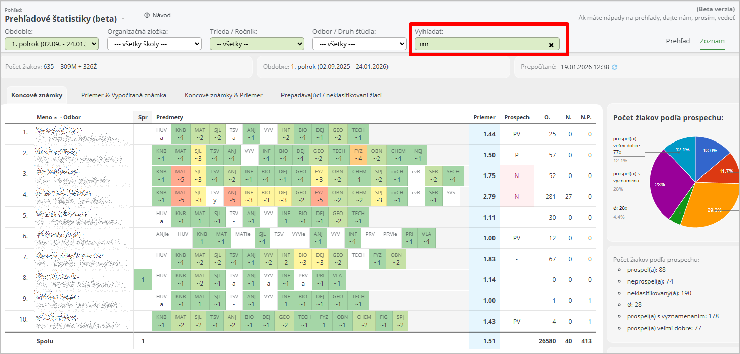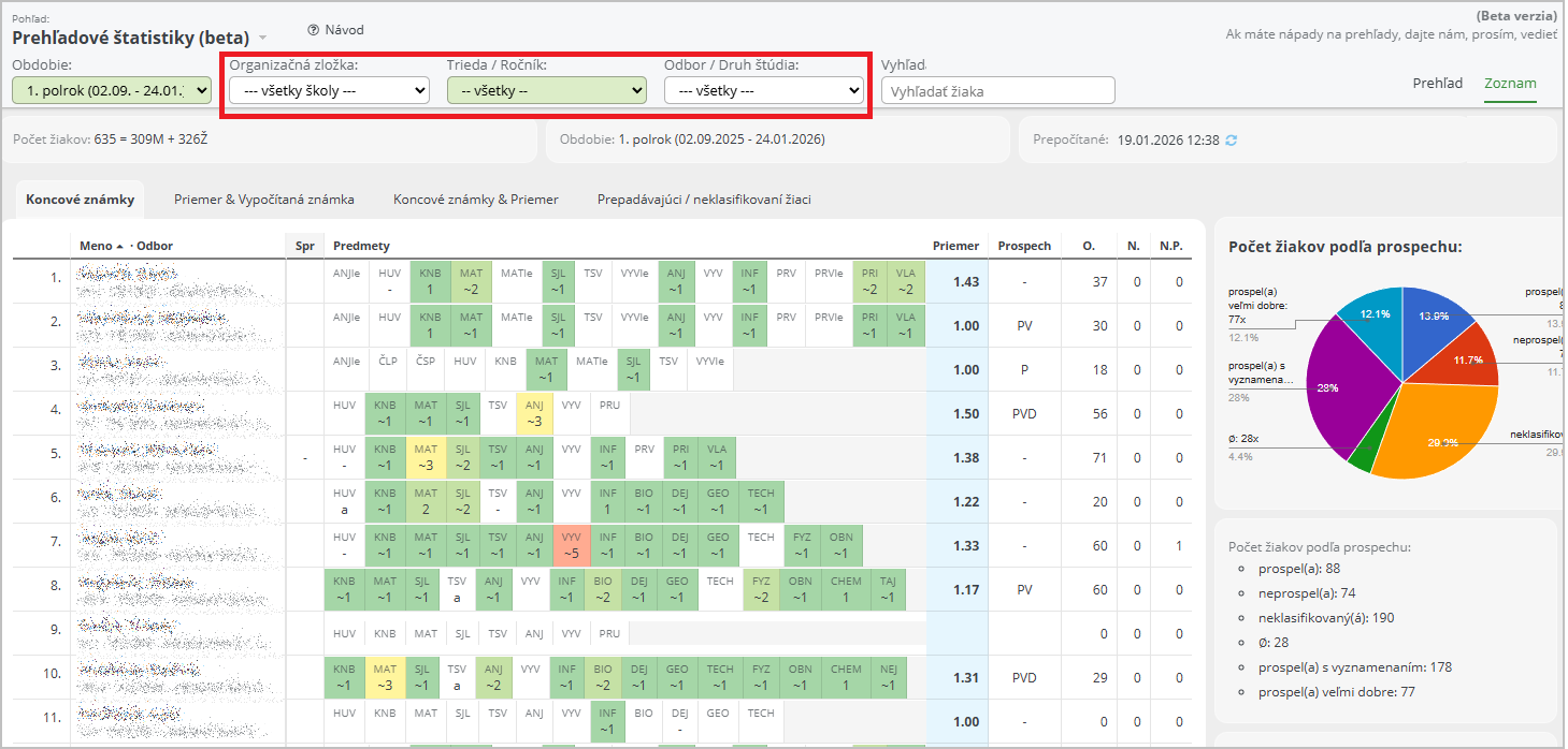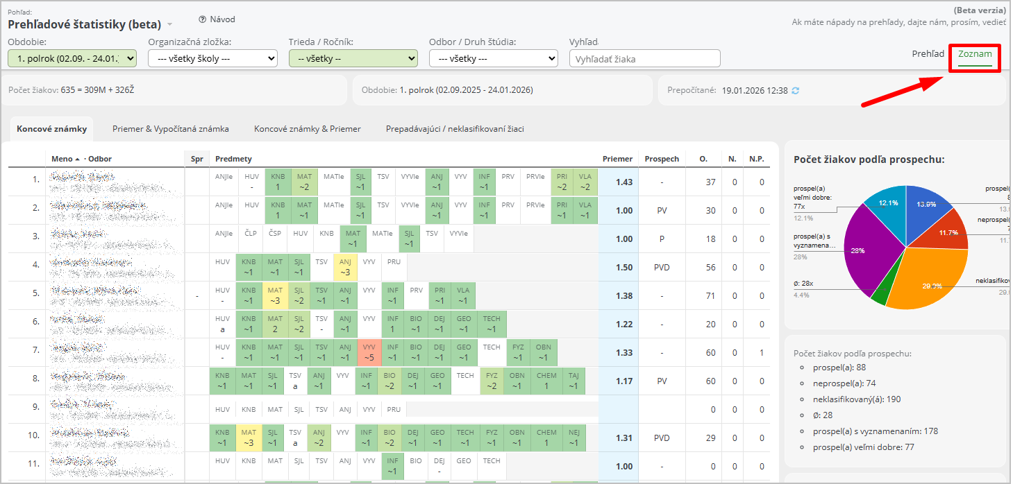 V štatistikách si prepnite pohľad na zoznam žiakov. Zobrazia sa všetci žiaci školy v abecednom poradí.