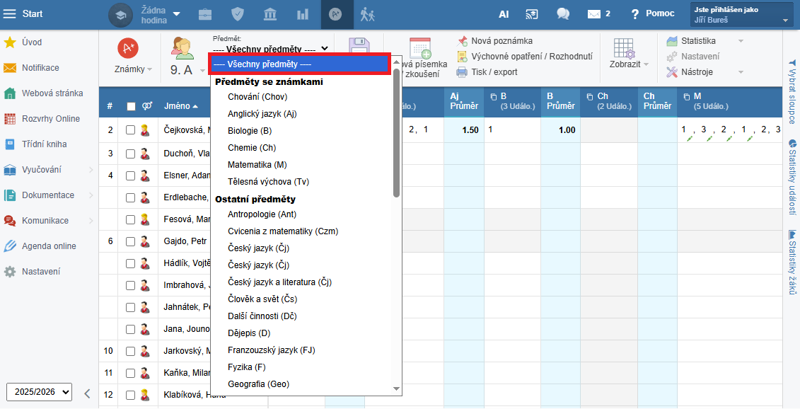 Vyberte svou třídu a v předmětech vyberte Všechny předměty.