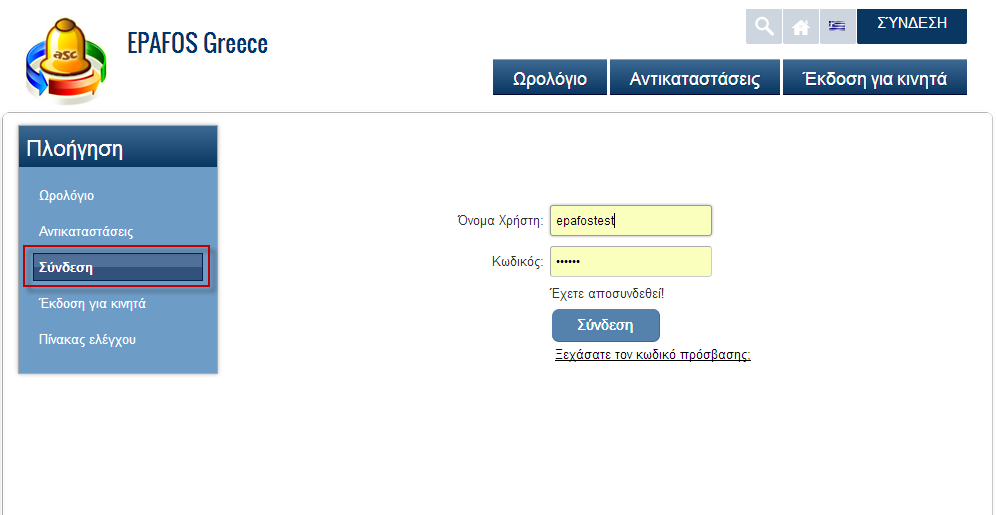 Η διεύθυνση της ιστοσελίδας, το όνομα χρήστη και ο κωδικός υπάρχουν στο email που έχετε λάβει από τον διαχειριστή της εφαρμογής. Εάν χάσετε το email αυτό, κάντε κλικ στην ερώτηση "Ξεχάσατε τον κωδικό πρόσβασης;", για να το λάβετε ξανά.