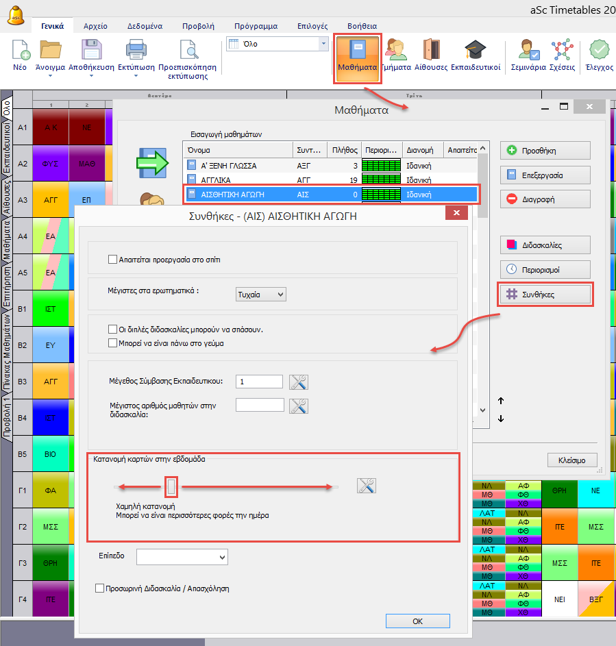 Στις Συνθήκες ενός μαθήματος μπορείτε να βρείτε μία μπάρα. Όσο πιο δεξιά την πάτε τόσο πιο ίσα θα μοιραστούν οι διδασκαλίες μέσα στην εβδομάδα.