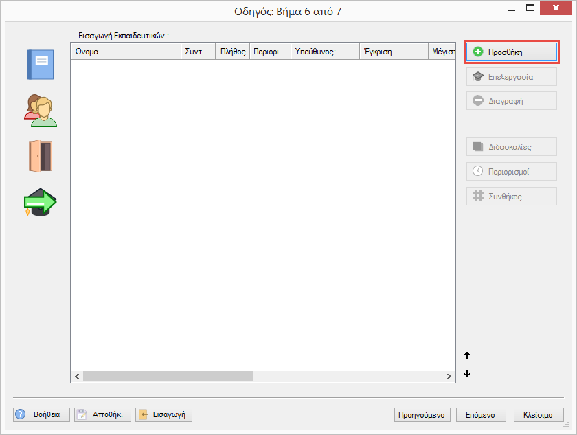 Εδώ μπορείτε να δημιουργήσετε, να επεξεργαστείτε ή να διαγράψετε εκπαιδευτικούς. Μπορείτε να χρησιμοποιήσετε τους “Περιορισμούς” ώστε να ορίσετε πότε μπορεί και πότε δεν μπορεί ο εκπαιδευτικός να διδάξει.