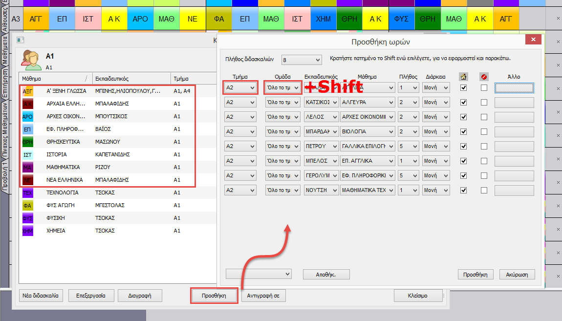 Στην περίπτωση που πολλοί εκπαιδευτικοί ή τμήματα έχουν παρόμοιες διδασκαλίες, μπορείτε να κάνετε κλικ την επιλογή Προσθήκη και να εισάγετε πολλές διδασκαλίες μαζί.