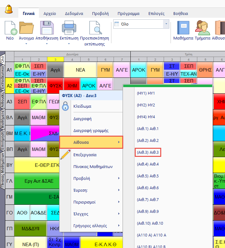 Εάν τοποθετήσετε μία κάρτα χειροκίνητα στο ωρολόγιο το πρόγραμμα αυτόματα διαλέγει μία από τις διαθέσιμες αίθουσες.
