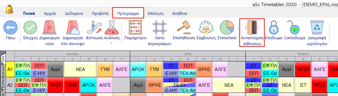 Κατά την διάρκεια της εισαγωγής θα πρέπει να ορίσετε διαθέσιμες αίθουσες για κάθε διδασκαλία. Η δημιουργία ύστερα τοποθετεί μια κάρτα μόνο όταν μία από τις πιθανές αίθουσες είναι διαθέσιμη. Άρα στην δημιουργία του ωρολογίου όλες οι διδασκαλίες τοποθετούνται στις αίθουσές τους.