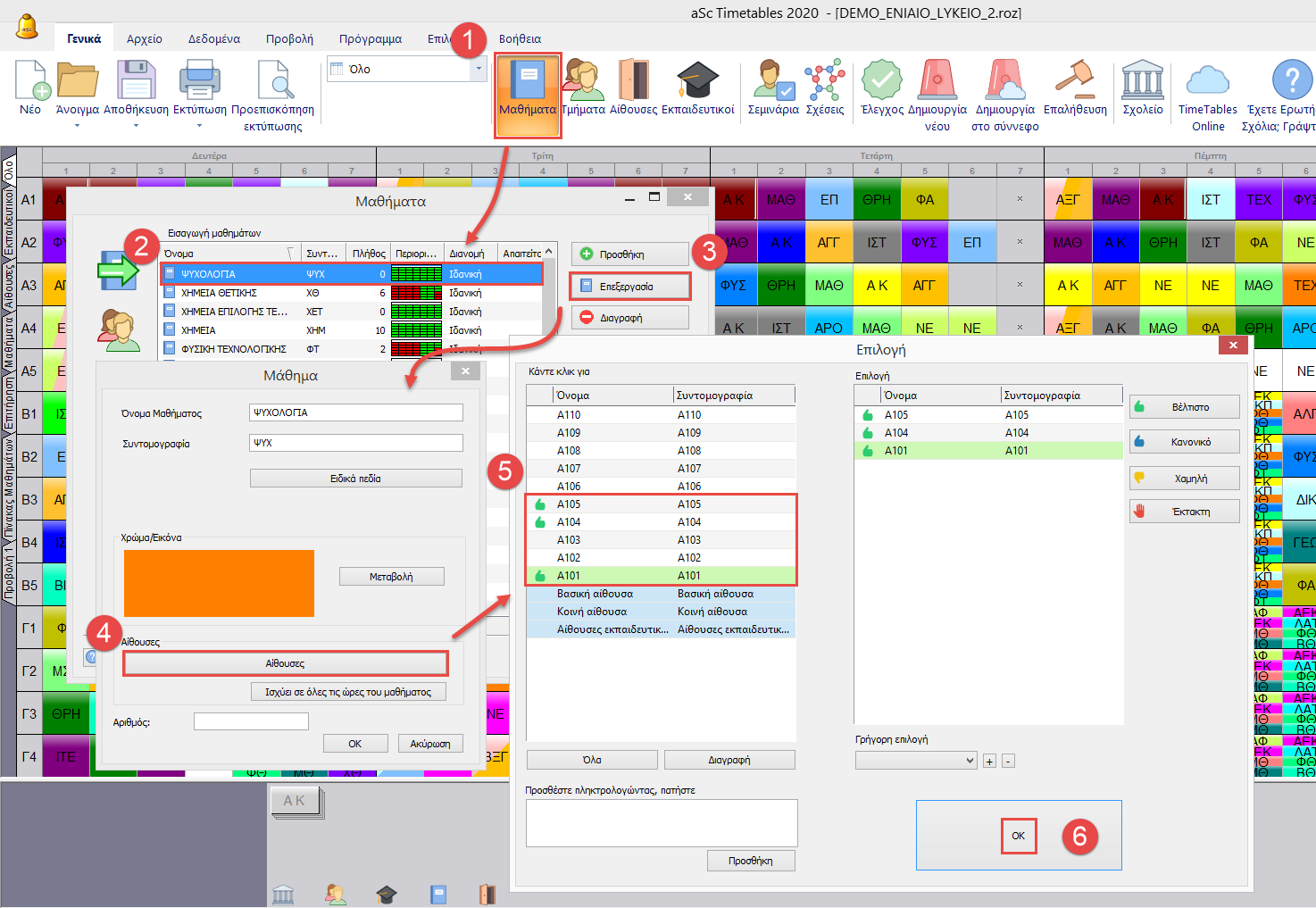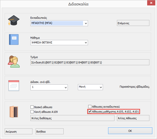 Όταν προσδιορίσετε αυτήν την πληροφορία τότε όλες οι καινούργιες διδασκαλίες αυτού του μαθήματος θα έχουν σαν προεπιλογή τις αίθουσες που ορίσατε.