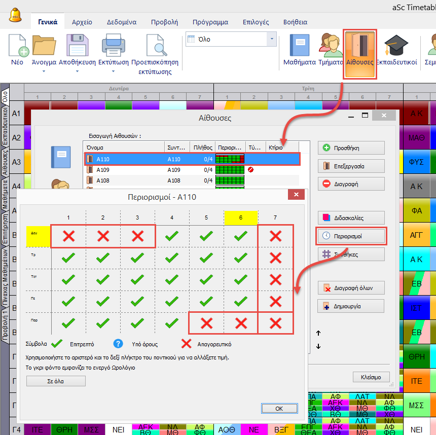 Όπως και με άλλα δεδομένα (π.χ. εκπαιδευτικοί, τμήματα) μπορείτε να ορίσετε Περιορισμούς για να καθορίσετε πότε μπορούν να χρησιμοποιηθούν ορισμένες αίθουσες.