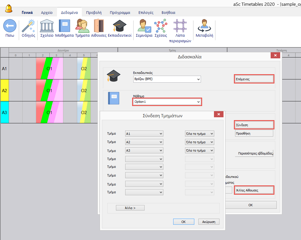 Μετά πρέπει να εισάγετε 4 διδασκαλίες για τη Επιλογή 1, μία για κάθε μάθημα που μπορεί να επιλεχθεί στην επιλογή 1. Κάθε φορά διαλέγετε έναν εκπαιδευτικό, ένα μάθημα και κάνετε σύνδεση τις 4 ομάδες από κάθε τμήμα.