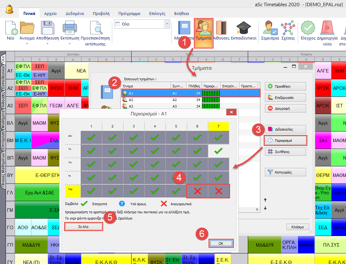 Μπορείτε να χρησιμοποιήσετε την λειτουργία “Σε όλα” για να αντιγράψετε τους περιορισμούς σε άλλα τμήματα.
