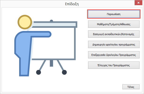 Η "Επίδειξη" μπορεί να ανοίξει, είτε από την αρχική οθόνη πριν δημιουργηθεί πρόγραμμα, είτε από το μενού Βοήθεια/Επίδειξη: