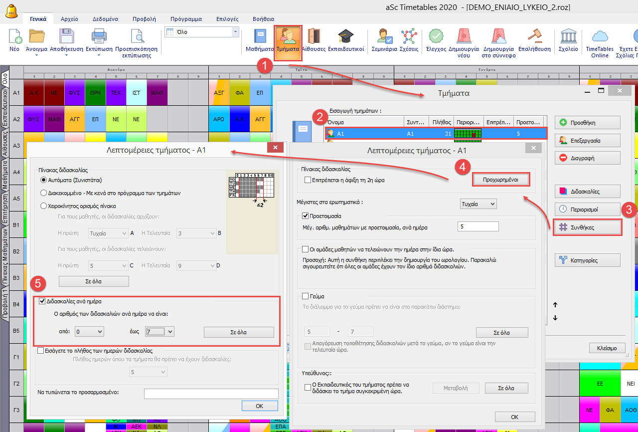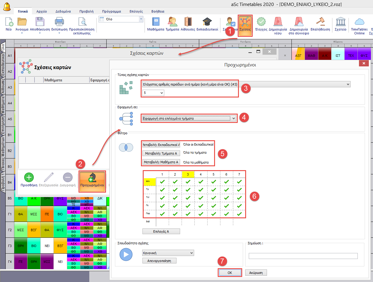 Άρα εάν χρησιμοποιήσετε την αυτόματη δημιουργία πίνακα διδασκαλίας θα ανατεθούν 6-8 περίοδοι κάθε μέρα, το πρόγραμμα δεν θα τοποθετήσει 9 περιόδους σε μία μέρα. Παρόλα αυτά μπορείτε να προσδιορίσετε εάν θέλετε μέγιστο αριθμό περιόδων 7. Κατευθυνθείτε στο μενού Γενικά/Τμήματα/Συνθήκες/Προχωρημένοι.