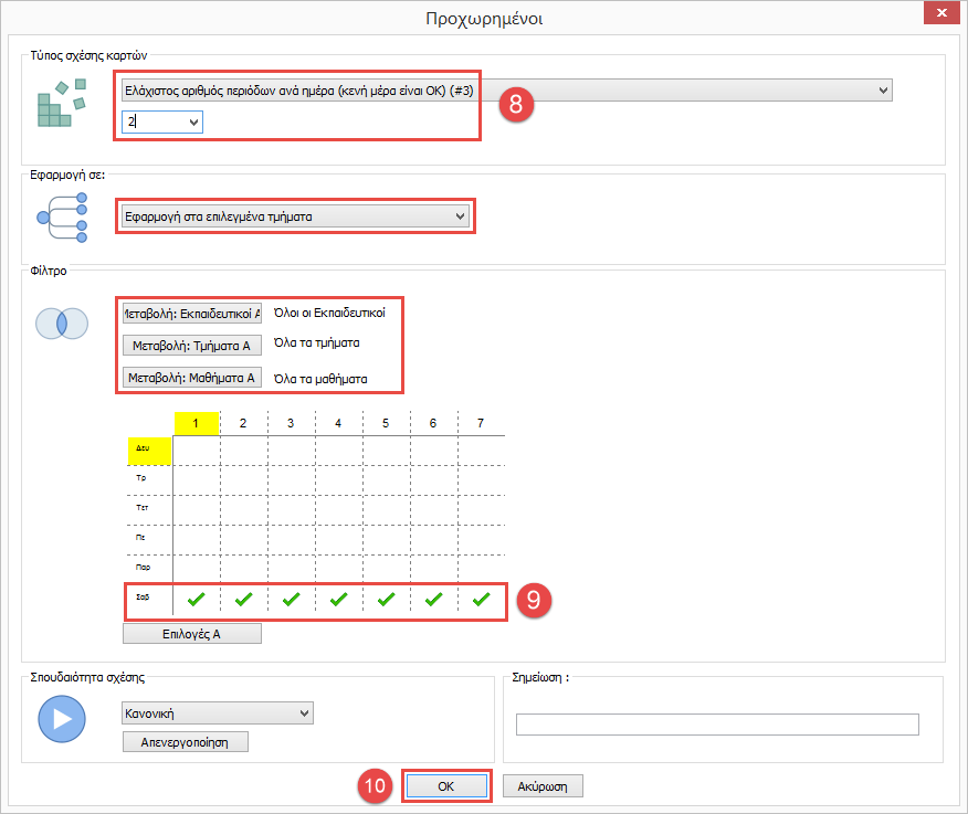 Παρόλα αυτά παρακαλούμε σημειώστε ότι από προεπιλογή το πρόγραμμα κάνει αυτόν τον υπολογισμό για εσάς. Εάν έχετε 32 διδασκαλίες κάθε 5ημερη εβδομάδα, τότε το πρόγραμμα θα επιτρέψει 6 – 8 διδασκαλίες ανά ημέρα. Άρα το να ορίσετε τον ελάχιστο/μέγιστο αριθμό περιόδων ανά ημέρα χρειάζεται μόνο εάν θέλετε να αλλάξετε αυτόν τον υπολογισμό ή να τον απενεργοποιήσετε.