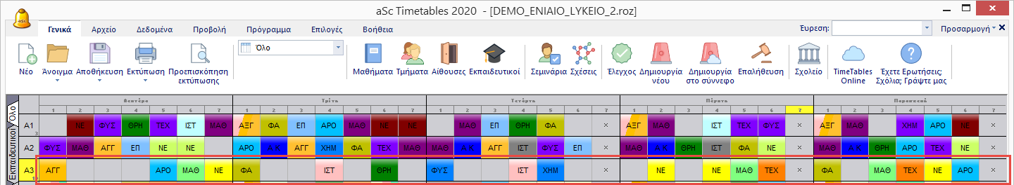 Παρόλα αυτά εάν το τμήμα έχει λιγότερες από 3 περιόδους ανά ημέρα το πρόγραμμα θα υποθέσει ότι είναι ειδικό τμήμα και θα απενεργοποιήσει την αυτόματη δημιουργία πίνακα διδασκαλίας γι αυτό το τμήμα.