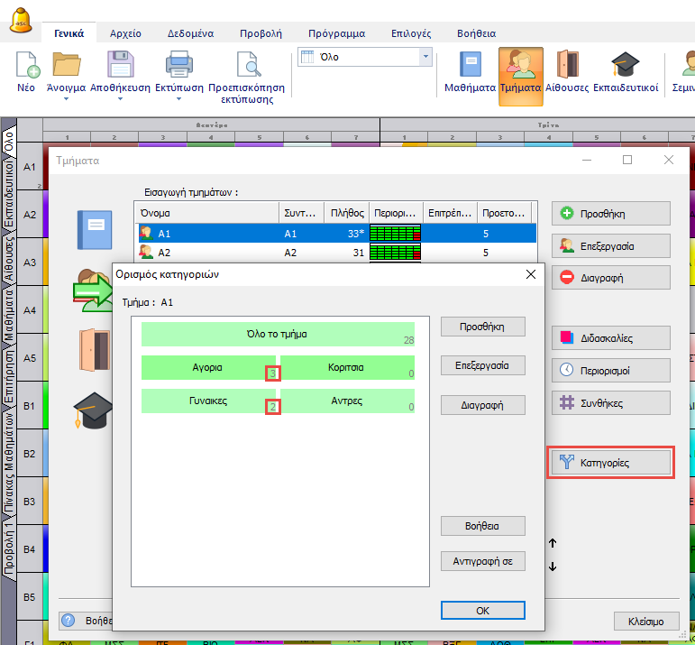 Παρακαλούμε σημειώστε ότι το πρόγραμμα μπορεί να τοποθετήσει διδασκαλίες ταυτόχρονα μόνο στην περίπτωση που προέρχονται από την ίδια κατηγορία σε ένα τμήμα.