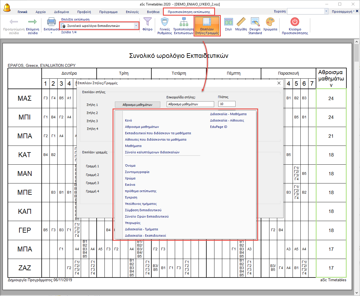 Για κάθε εκτύπωση μπορείτε να ορίσετε αρκετές παραπάνω στήλες και γραμμές. Κάντε κλικ στην επιλογή Επιπλέον στήλες/γραμμές. Στο παράθυρο που θα εμφανιστεί κάντε κλικ στην πρώτη γραμμή για τις στήλες ή για τις γραμμές και επιλέξτε μία από τις διαθέσιμες επιλογές. Μπορείτε να ορίσετε επίσης το κείμενο της επικεφαλίδας και το πλάτος της στήλης ( ή ύψος της γραμμής ).