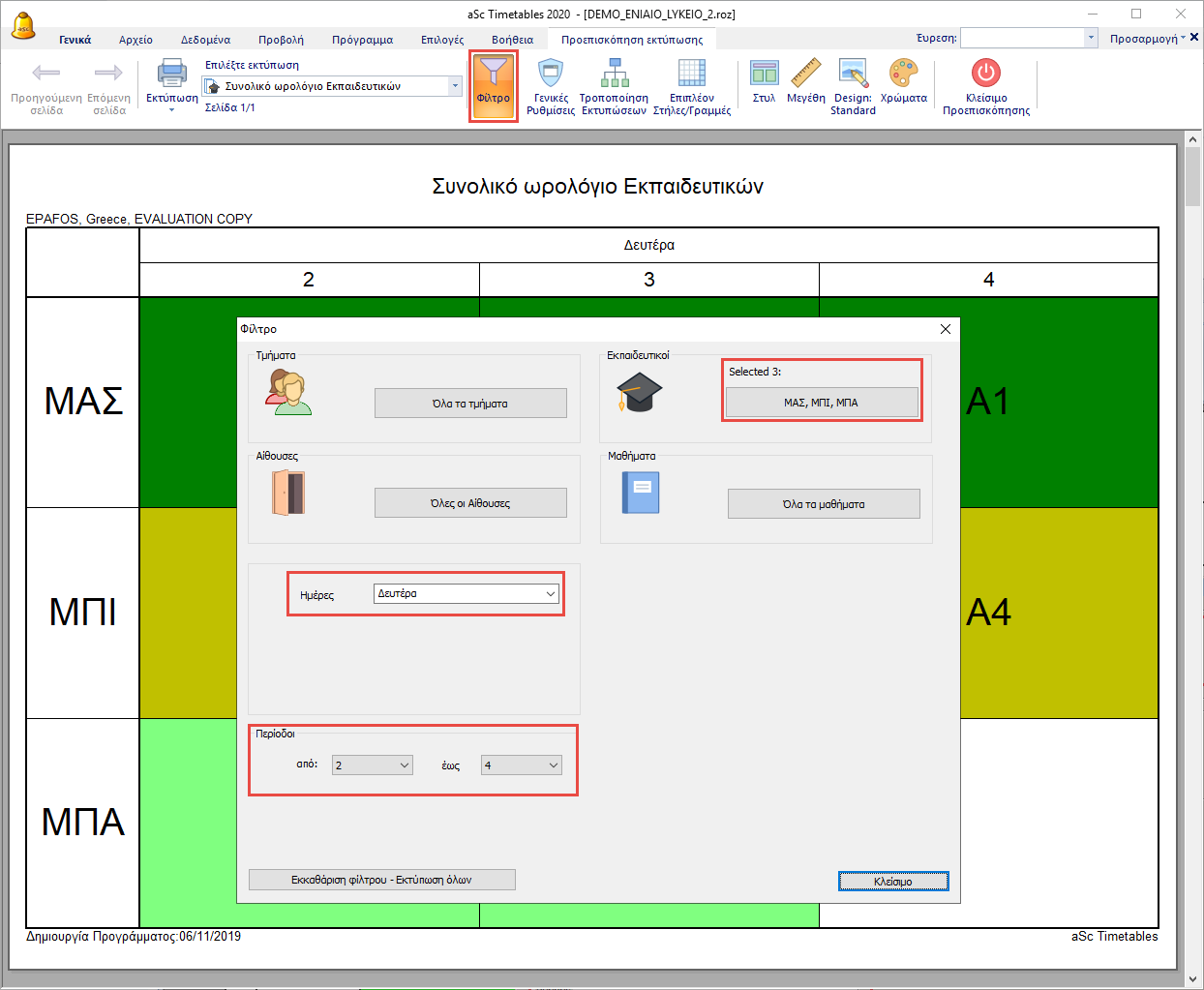 Για παράδειγμα, εδώ θα τυπωθεί ωρολόγιο μόνο για 3 εκπαιδευτικούς την Δευτέρα από την 2η έως την 4η περίοδο.