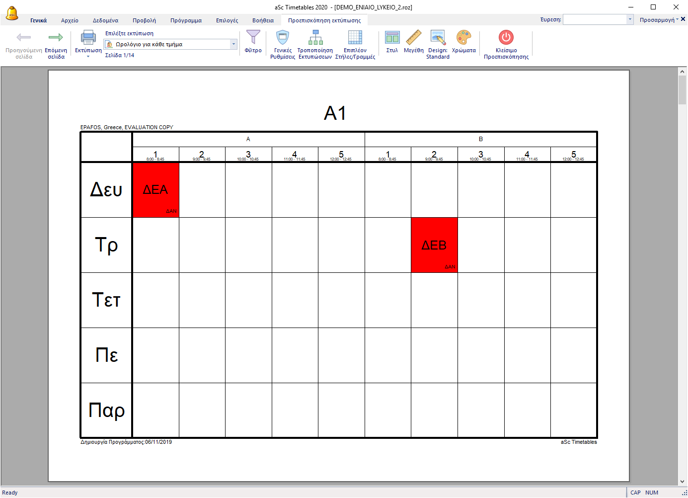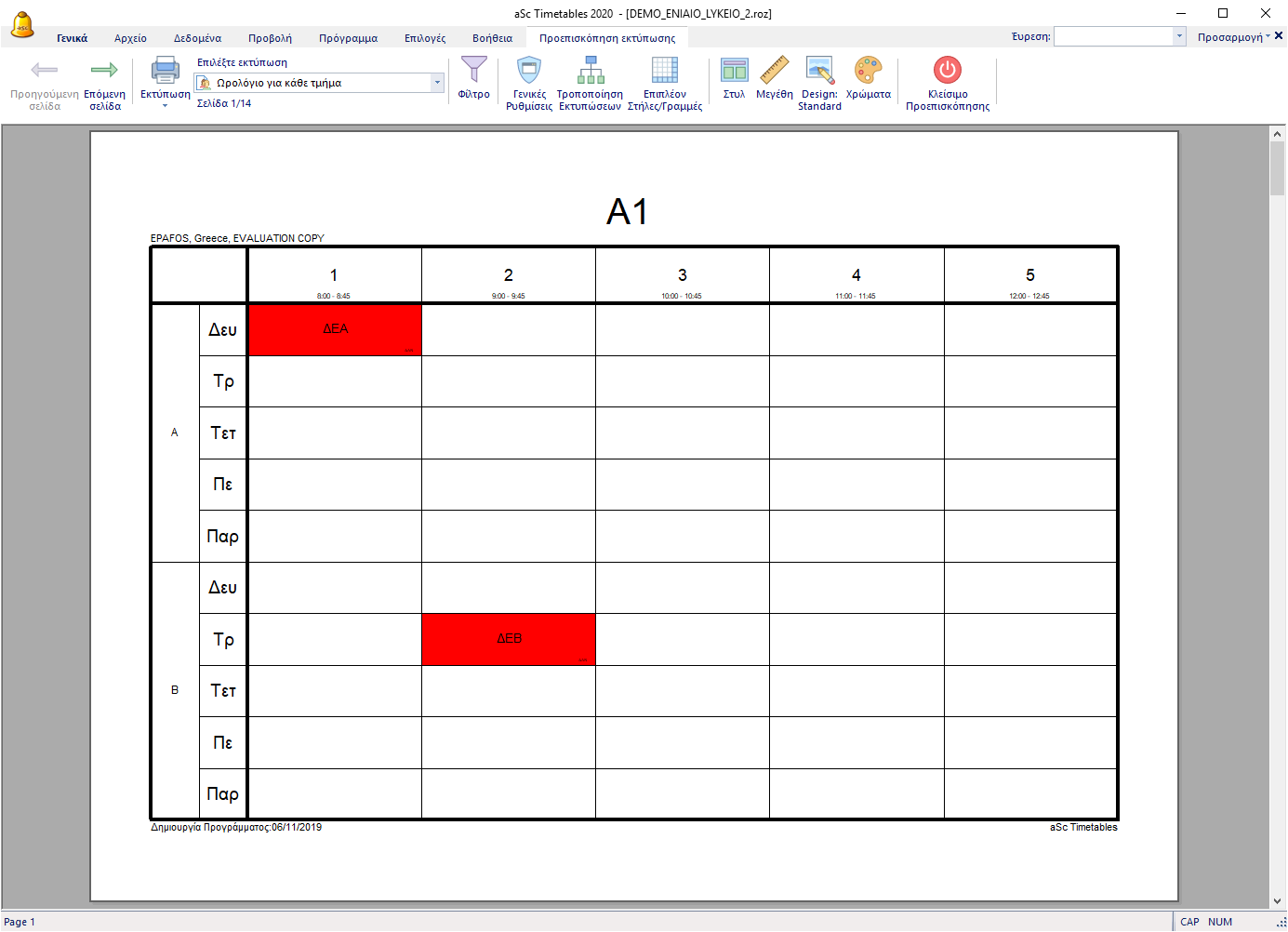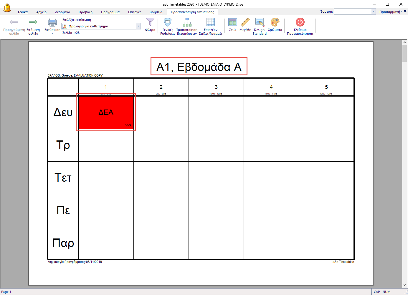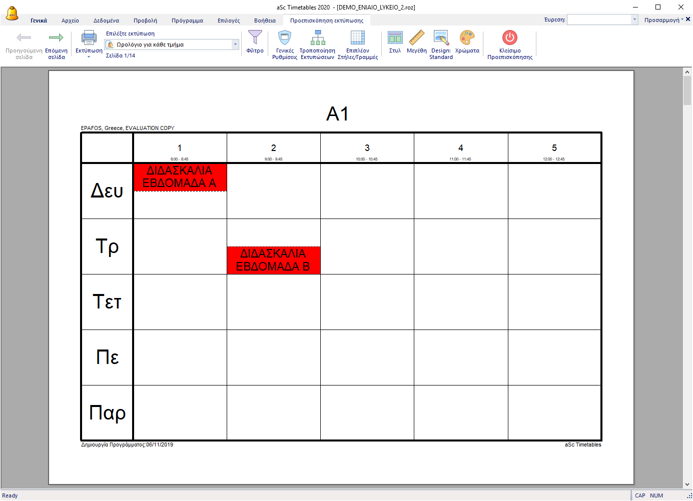 Από προεπιλογή το πρόγραμμα εκτυπώνει δύο εβδομάδες ή δύο εξάμηνα σε μία σελίδα, με τη γραμμή διαχωρισμένη για κάθε εβδομάδα. Το επάνω κομμάτι είναι η εβδομάδα Α και το κάτω η εβδομάδα Β.