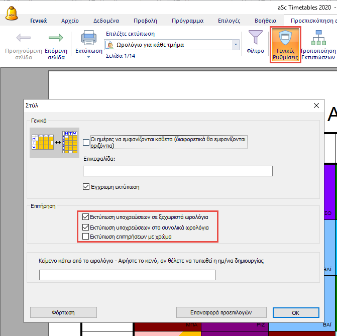 Στο μενού Γενικά/Προεπισκόπηση Εκτυπώσεων/Γενικές Ρυθμίσεις, μπορείτε να κάνετε κλικ στην επιλογή “Εκτύπωση υποχρεώσεων σε ξεχωριστά ωρολόγια” και “Εκτύπωση υποχρεώσεων στα συνολικά ωρολόγια” ανάλογα τις ανάγκες σας.