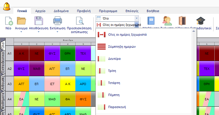 Από προεπιλογή το πρόγραμμα δείχνει όλες τις μέρες στην συνολική όψη. Εάν για παράδειγμα θέλετε να βλέπετε μόνο μία μέρα μπορείτε να ενεργοποιήσετε την επιλογή ημερών.